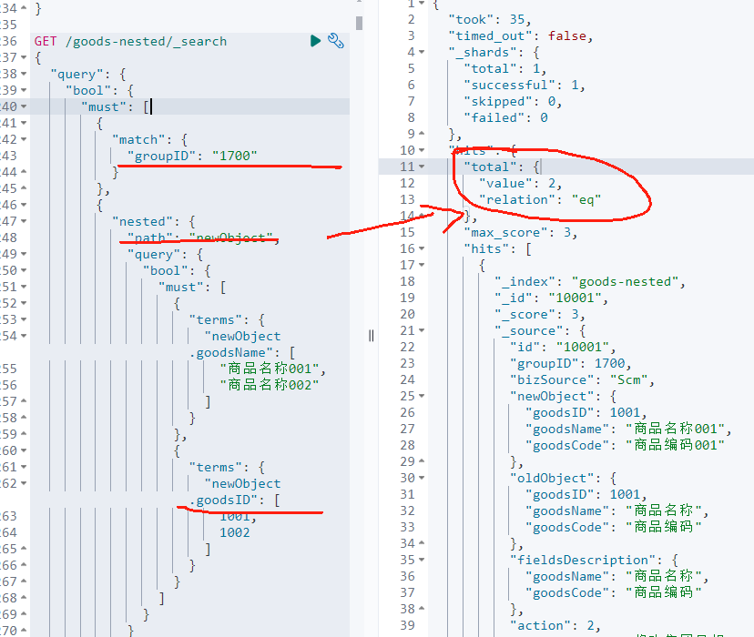 GET /goods-nested/_search{"query": {"bool": {"must": [{"match": {"groupID": "1700"}},{"nested": {"path": "newObject","query": {"bool": {"must": [{"terms": {"newObject.goodsName": ["商品名称001","商品名称002"]}},{"terms": {"newObject.goodsID": [1001,1002]}}]}}}}]}}}
