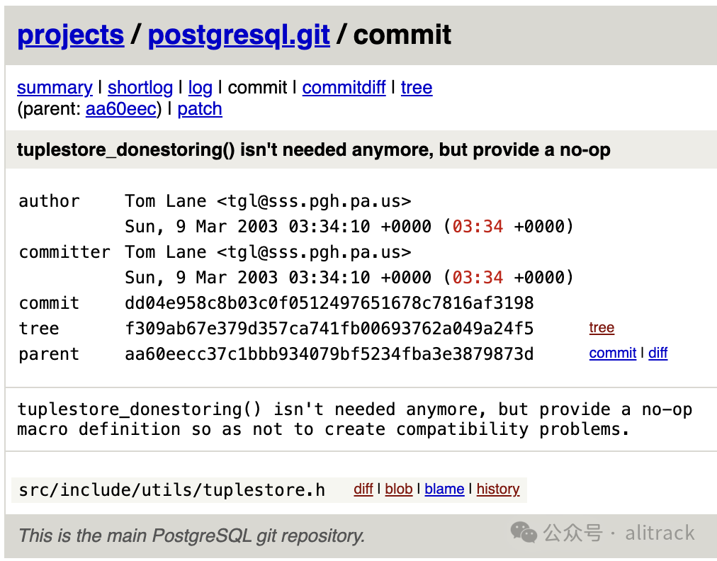 出于好奇,我想看看它是从哪个版本开始就不再有意义,经过一番搜索发现,从大佬 Tom Lane 2003-03-09 的 commit( dd04e958c8b03c0f0512497651678c7816af3198[1]) 开始,