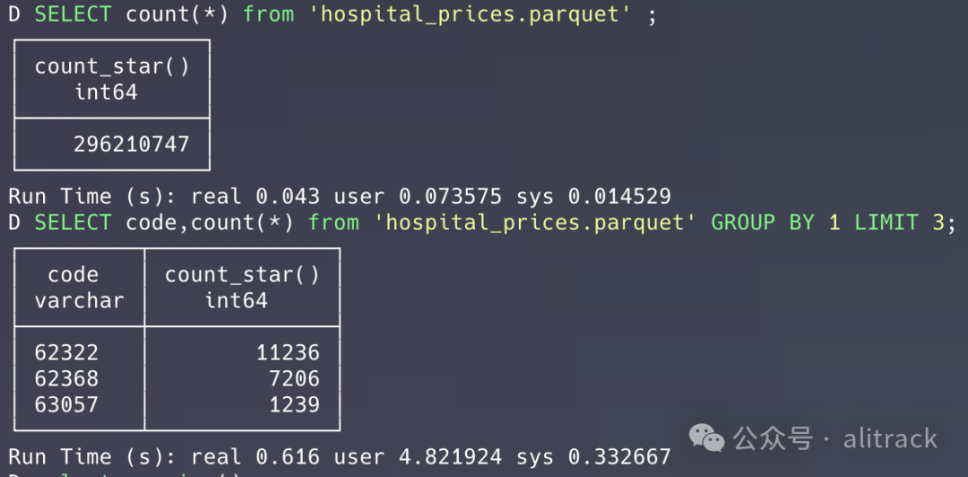 D SELECT code,count(*) from 'hospital_prices.parquet' GROUP BY 1 LIMIT 3;