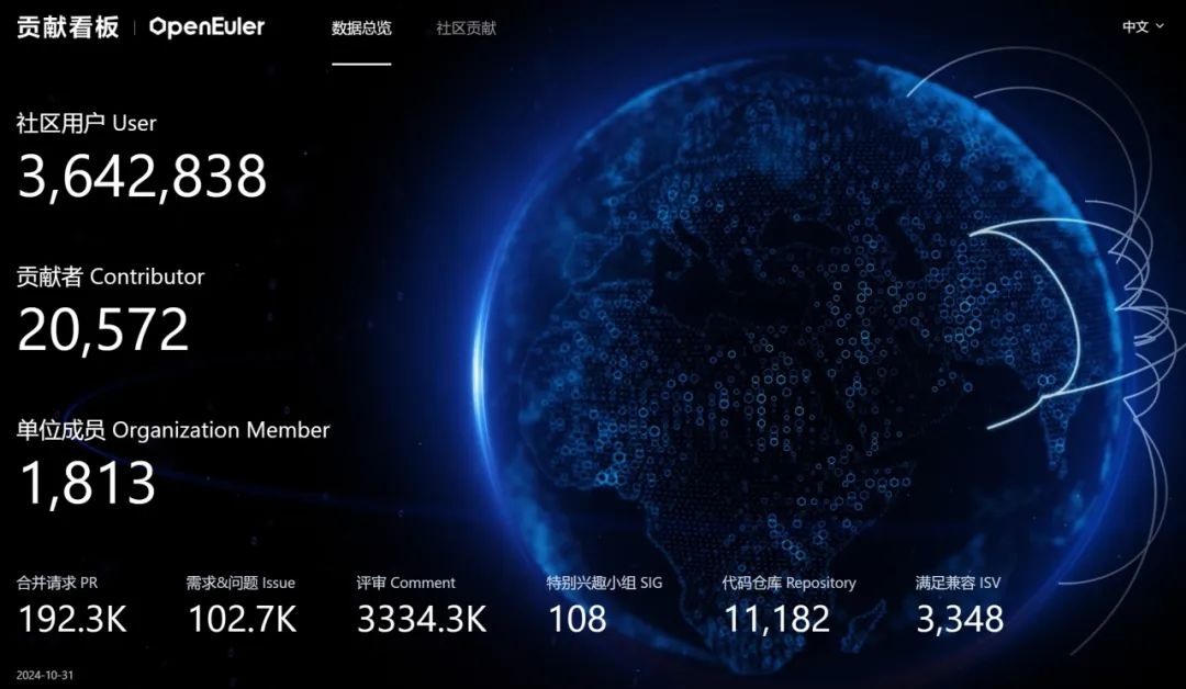 截至2024年10月31日,openEuler 社区用户累计超过364万。超过2万名开发者在社区持续贡献。社区累计产生 192.3K个PRs、102.7K条Issues。目前,加入openEuler 社区的单位成员1813家,本月新增38家。
