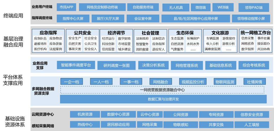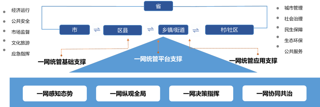 一网统管解决方案围绕社会治理多个领域,建设省、市、区、街道、社区五级网格体系,高位统筹数据汇聚、研判分析和绩效考核,支撑基层属地治理的联动指挥调度,以及镇(街道)重点源头信息采集、联动指挥处置,实现“一张网多元参与、一中心指挥调度、一张图要素汇聚、一站式智能研判、一体化绩效考核”市域社会治理现代化建设,推动网格化社会治理与信息化深度融合。“一网统管”平台围绕经济调节、市场监管、社会管理、公共服务和生态环保等政府职能,对标一流、瞄准一流,运用数字技术赋能治理模式变革,形成较为完善的横向到边、纵向到底、全闭环的市、区县、街/镇/镇、社区/村、网格“一网统管”治理体系,实现 “一网感知态势、一网纵观全局、一网决策指挥、一网协同共治”。