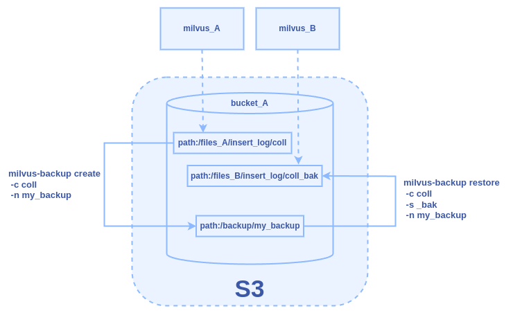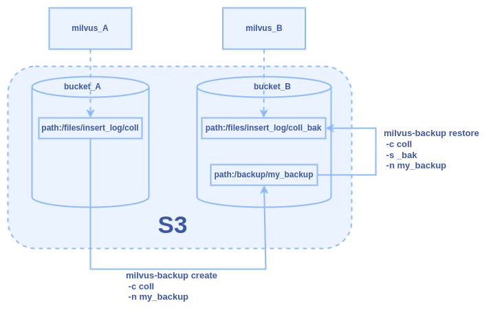 从一个 Milvus 实例(Milvus_A)备份一个 Collection,并将其恢复到同一 S3 服务中的另一个 Milvus 实例(Milvus_B),但使用不同的 Bucket。