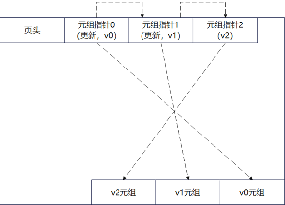 当一个更新操作将 v0 版本元组更新为v1 版本元组后,如果 v0 元组所在页面有空闲空间,则直接在该页面内插入更新后的v1元组,并将v0的元组指针指向v1的元组指针。在此过程中,新版本元组以追加写的方式和被更新的老版本元组混合存放,从而可以减少更新操作的I/O开销。