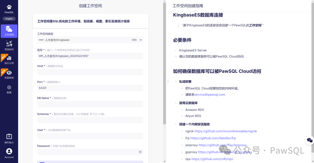 工作空间是SQL优化的工作环境,PawSQL支持两种方式为KingbaseES 创建SQL优化任务的工作空间: