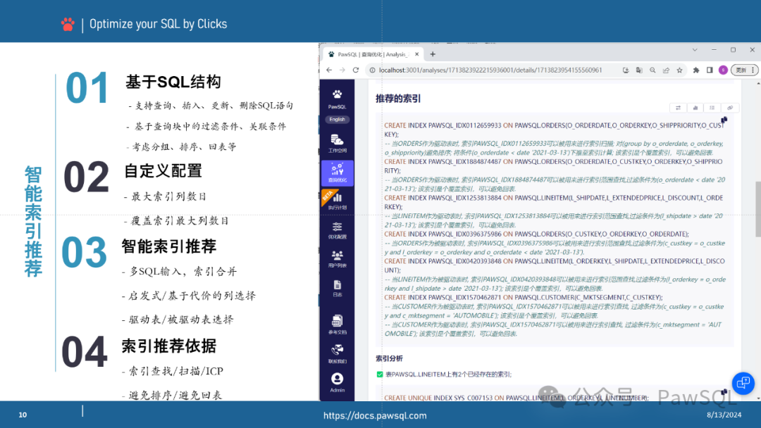 PawSQL的智能索引推荐引擎为KingbaseES 上的应用查询提供最优索引策略,以适应各种SQL语法需求,显著提升查询效率。