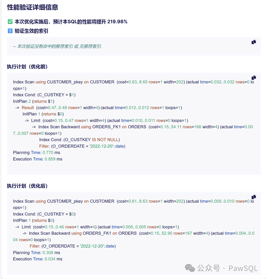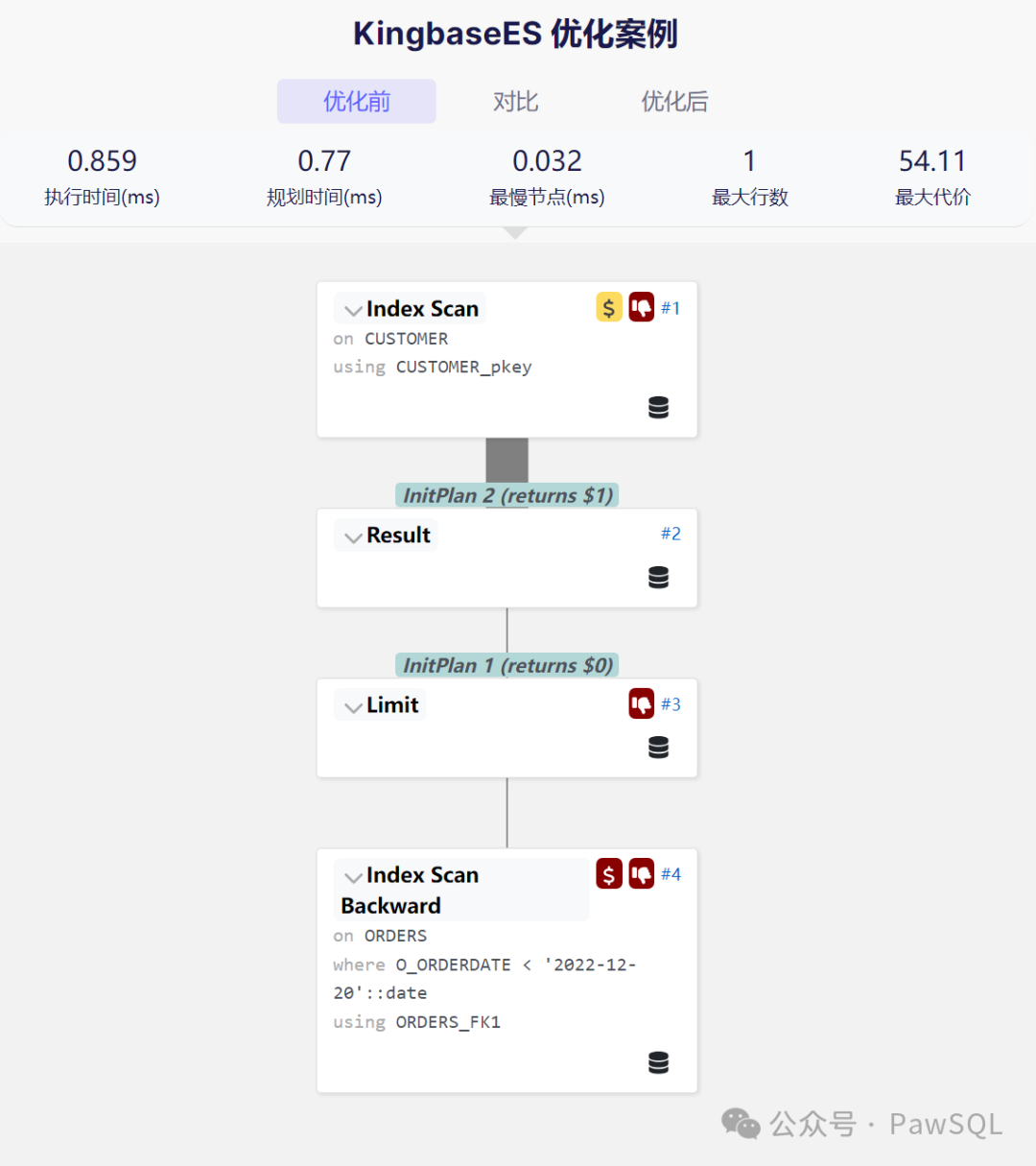 PawSQL自动采集SQL优化前后的KingbaseES 数据库的执行计划,获取优化前后的执行代价,确保推荐的优化建议能够真实提升数据库性能。