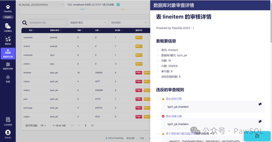 PawSQL性能巡检平台支持对KingbaseES V8的数据库对象进行定时或手动巡检,覆盖表、列、字符集、索引、约束等各种数据库对象,以识别潜在的安全、性能等潜在问题,并给出警示。