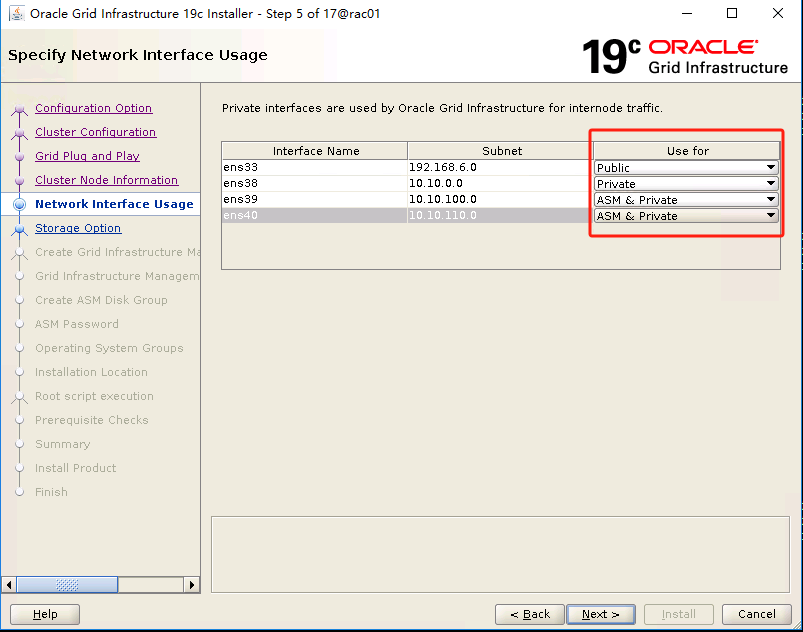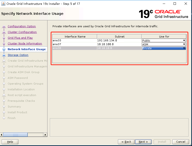正确的选择:192.168.134.0是业务网络选择Public,10.10.10.0是心跳网络选择Private,10.10.100.0是存储网络选择ASM
