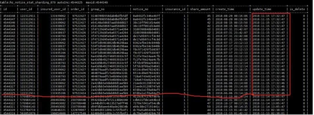 (1) 分析max id及autoincrement的规律 由于用户的表设置了ON UPDATE CURRENT_TIMESTAMP列,因此可以把所有的出错的表的max id、autoincrement及最近更新的几条记录抓取出来,看看是否有什么规律。抓取的信息如下: