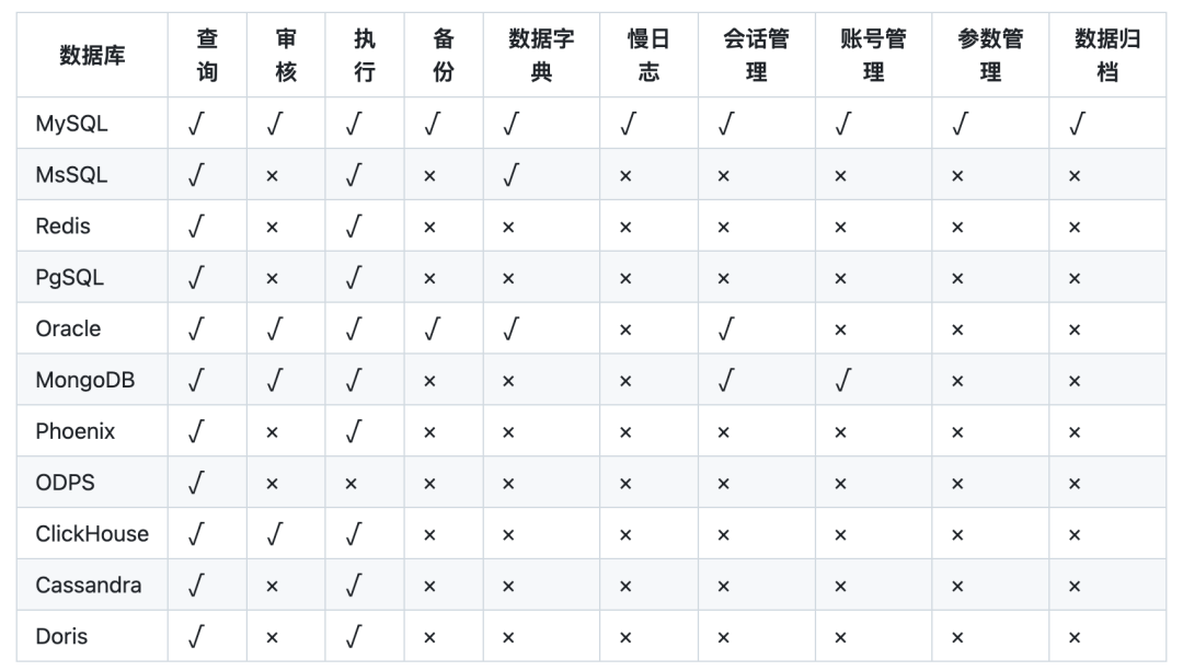Archery 支持广泛的数据库系统,包括 MySQL、MsSQL、Redis、PostgreSQL、Oracle、MongoDB、Phoenix 等。平台提供跨数据库的权限管理、审核执行、查询和优化支持,旨在为不同规模的数据库环境提供高效便捷的解决方案。