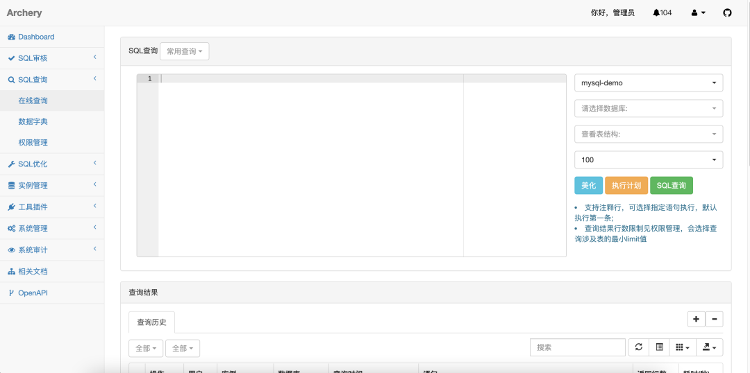 Archery 是一个开源的 SQL 审核查询平台,主要用于简化和自动化 SQL 相关的审批、执行、查询及优化过程。它支持多种数据库类型,提供多种 SQL 审核与优化工具,帮助团队提高数据库操作的效率和安全性。平台集成了自动审批、权限管理、脱敏查询等功能,能够有效降低人为错误并加速 SQL 工单的处理流程。
