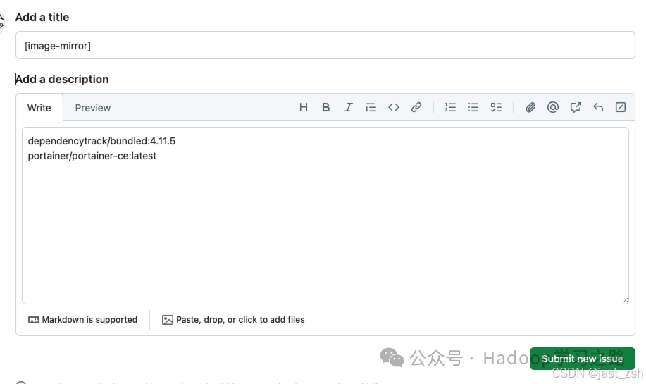 1. 在issue描述中填写需要同步的镜像,多个镜像可以换行,标题随意,点击提交。