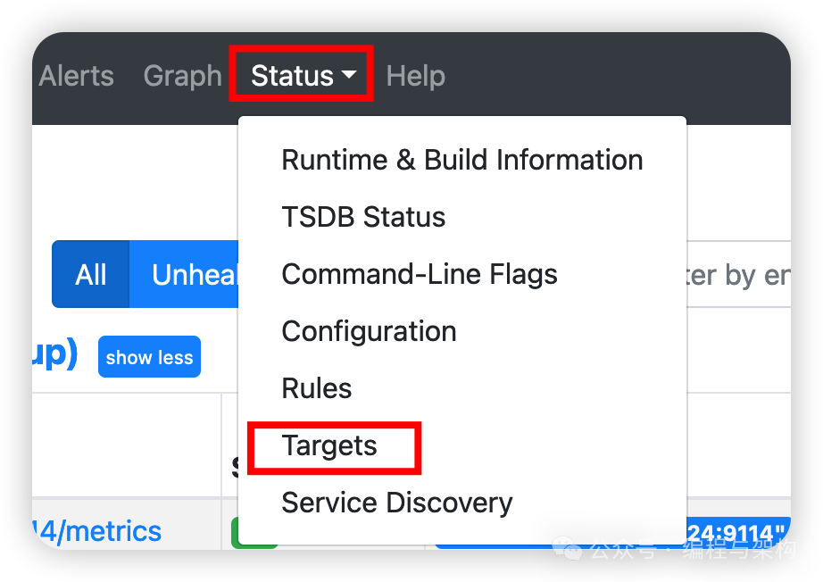 。在“Targets”页面,您应该能看到ElasticSearch的监控状态为UP
