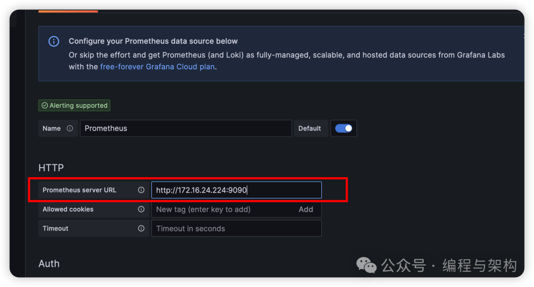 1. 在Grafana中创建Prometheus数据源,输入Prometheus的地址
