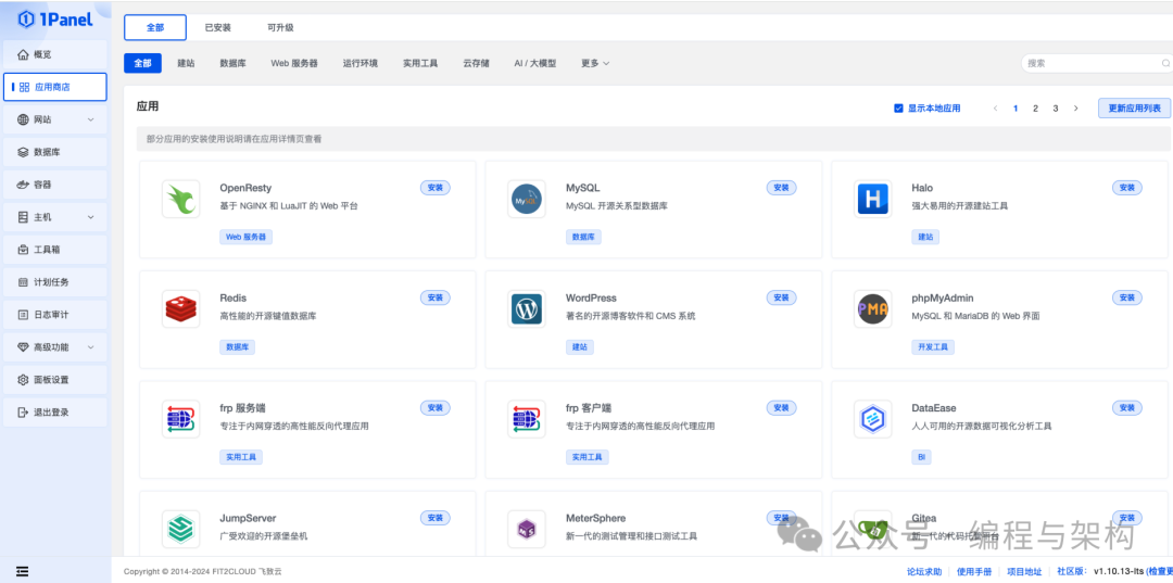 1Panel 提供了一个便捷的应用商店,您可以在其中一键安装各种常用的应用,如 MySQL、Nginx、WordPress 等。这大大简化了运维人员的工作,提高了效率。