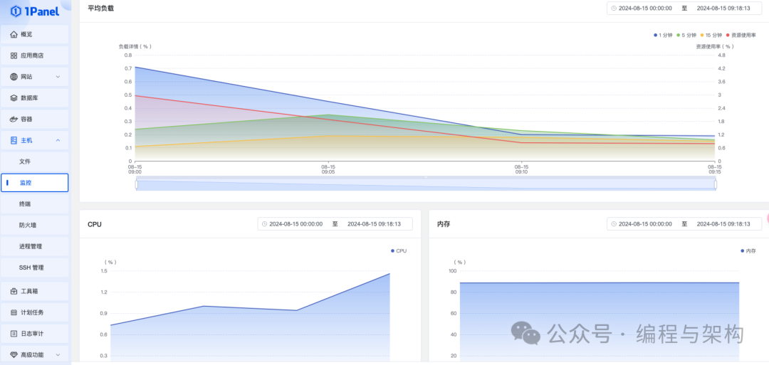 1Panel 内置监控和报警功能,能够对关键指标(如 CPU、内存、网络流量等)进行实时监控。当监控指标超过设定的阈值时,系统会自动触发报警,通知管理员采取相应的措施。