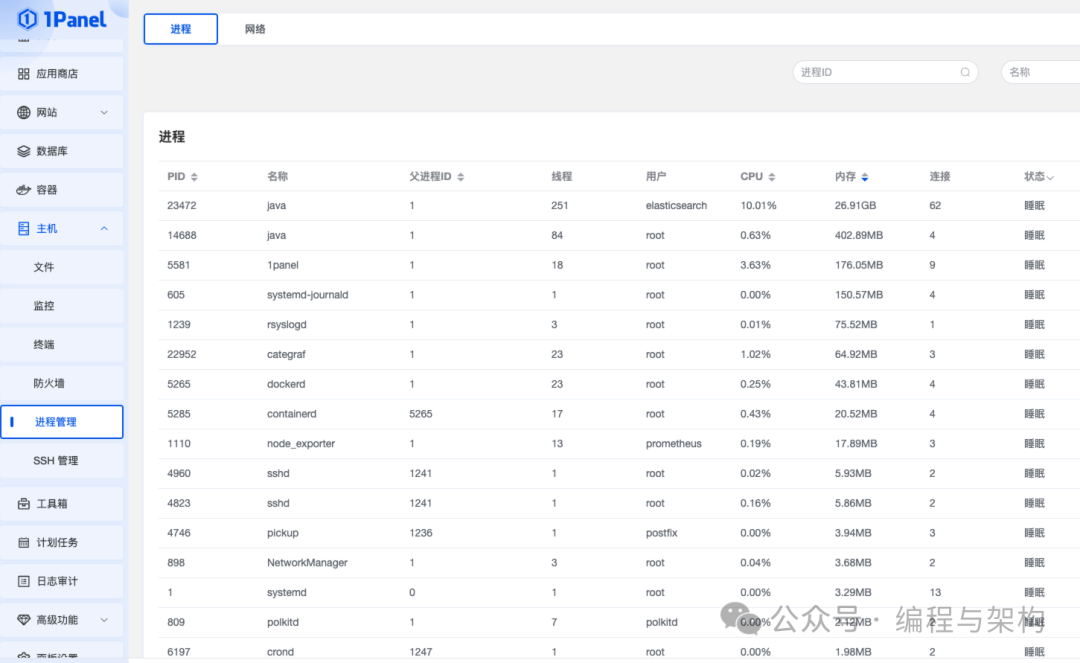 提供对服务器进程的监控和管理功能,可以随时查看和管理运行中的进程,及时响应异常进程。