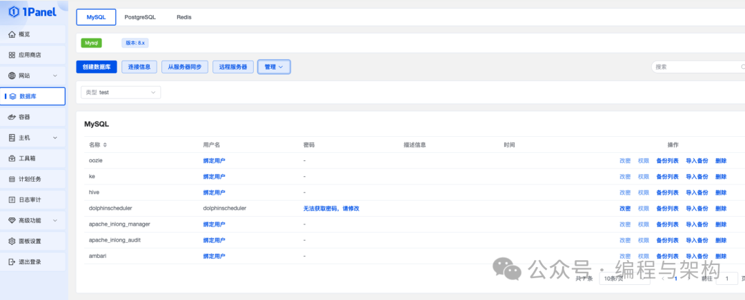 1Panel 的数据库管理模块支持多种数据库类型,如 MySQL、PostgreSQL 等。您可以通过图形化界面轻松进行数据库的备份、还原、用户管理等操作。