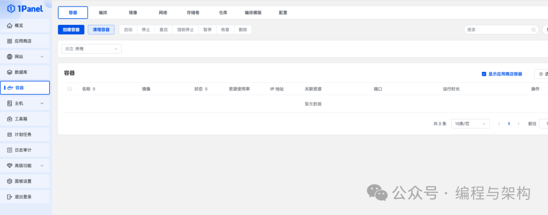 1Panel 还支持容器管理功能,您可以方便地管理 Docker 容器,进行容器的创建、启动、停止、删除等操作,非常适合开发和测试环境。