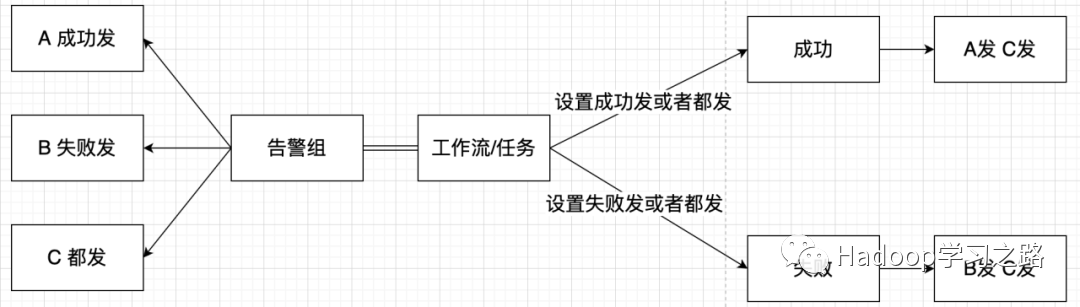 用户需要创建告警实例,在创建告警实例时,需要选择告警策略,有三个选项,成功发、失败发,以及成功和失败都发。在执行完工作流或任务时,如果触发告警,调用告警实例发送方法会进行逻辑判断,将告警实例与任务状态进行匹配,匹配则执行该告警实例发送逻辑,不匹配则过滤。创建完告警实例后,需要同告警组进行关联,一个告警组可以使用多个告警实例。告警模块支持场景如下: