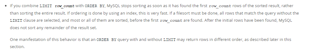 上面官方文档里面有提到如果你将Limit row_count与order by混用,mysql会找到排序的row_count行后立马返回,而不是排序整个查询结果再返回。如果是通过索引排序,会非常快;如果是文件排序,所有匹配查询的行(不带Limit的)都会被选中,被选中的大多数或者全部会被排序,直到limit要求的row_count被找到了。如果limit要求的row_count行一旦被找到,Mysql就不会排序结果集中剩余的行了。