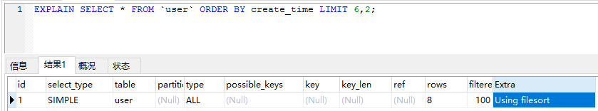 可以确认是用的文件排序,表确实也没有加额外的索引。所以我们可以确定这个SQL执行时是会找到limit要求的行后立马返回查询结果的。