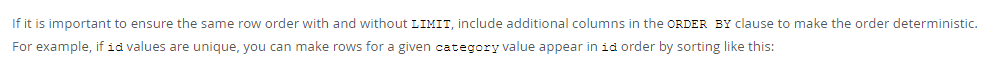 如果想在Limit存在或不存在的情况下,都保证排序结果相同,可以额外加一个排序条件。例如id字段是唯一的,可以考虑在排序字段中额外加个id排序去确保顺序稳定。