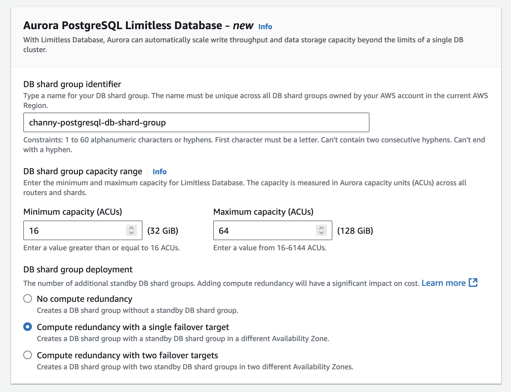 对于 Aurora Limitless Database,请输入数据库分片组的名称以及以所有路由器和分片的 Aurora 容量单位(ACU)衡量的最小和最大容量值。数据库分片组中路由器和分片的初始数量由此最大容量决定。当节点的当前利用率太低而无法处理负载时,Aurora PostgreSQL Limitless Database 会将该节点扩展到更高的容量。当节点的当前容量高于所需容量时,它会将节点向下扩展到较低的容量。