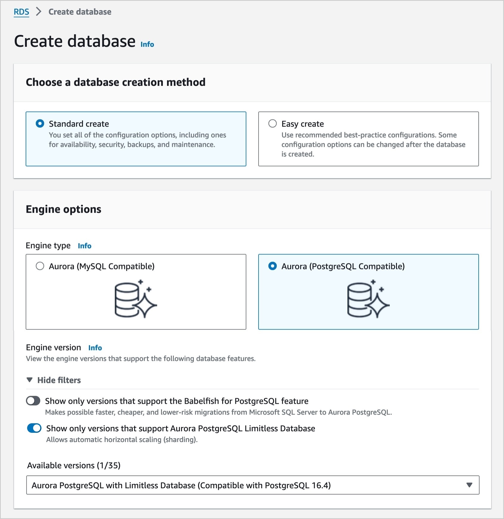 打开 Amazon Relational Database Service(Amazon RDS)控制台并选择创建数据库。对于引擎选项,请选择 Aurora(兼容 PostgreSQL)和带无限数据库的 Aurora PostgreSQL(与 PostgreSQL 16.4 兼容)。