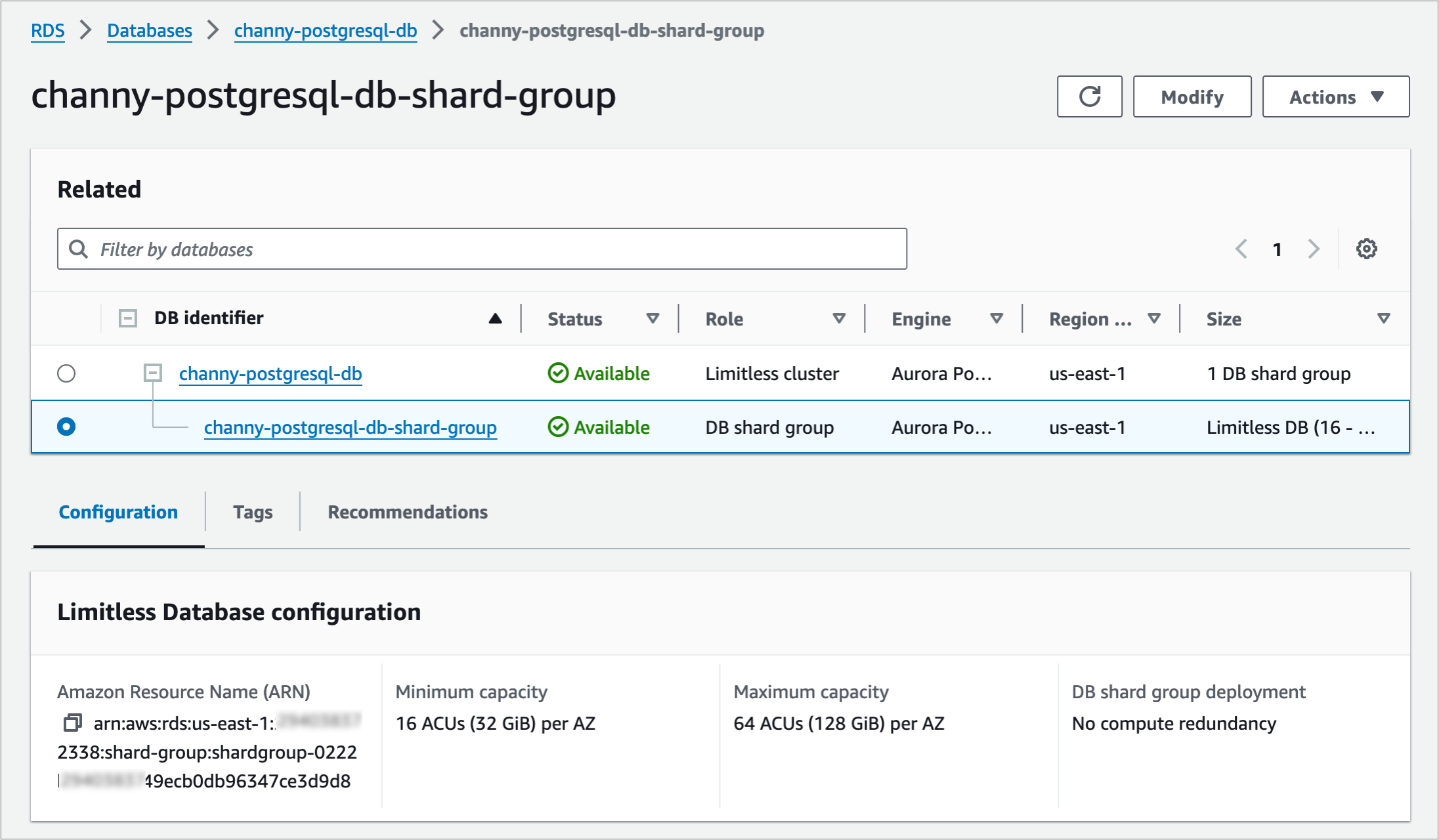 可以连接、重新启动或删除数据库分片组,也可以更改容量、拆分分片或在数据库分片组中添加路由器。要了解更多信息,请访问 Amazon Aurora 用户指南中的使用数据库分片组。