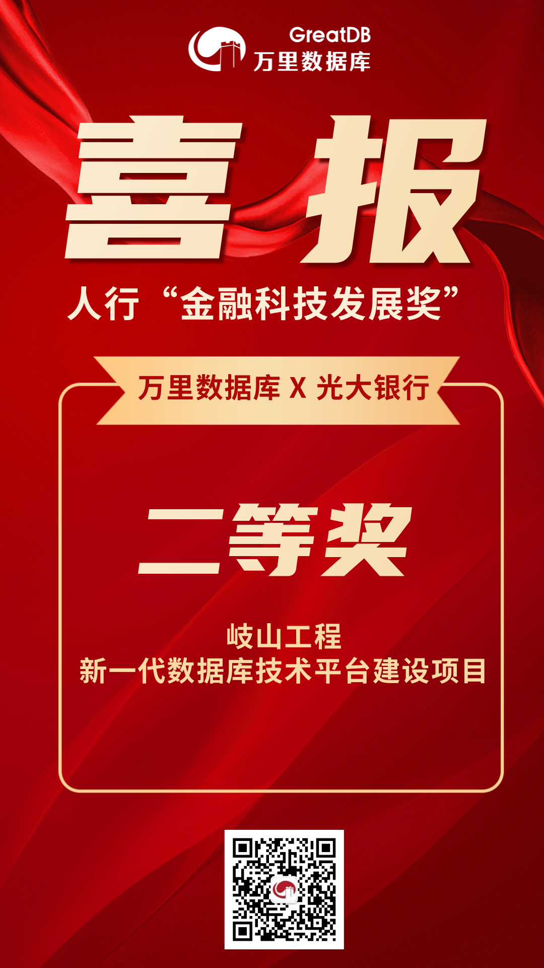 近日,中国人民银行官方发布“2023年度金融科技发展奖获奖项目”名单。万里数据库深度参与的中国光大银行(以下简称:光大银行)岐山工程--新一代数据库技术平台建设项目荣获二等奖,彰显了光大银行在金融科技领域的技术先进性和创新能力,也对万里数据库在金融数字化领域的专业技术实力做出肯定。