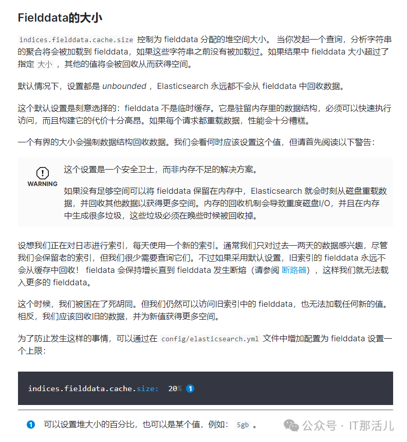 ES配置中提到的FieldData指的是字段数据。当排序(sort),统计(aggs)时,ES把涉及到的字段数据全部读取到内存(JVM Heap)中进行操作。相当于进行了数据缓存,提升查询效率。