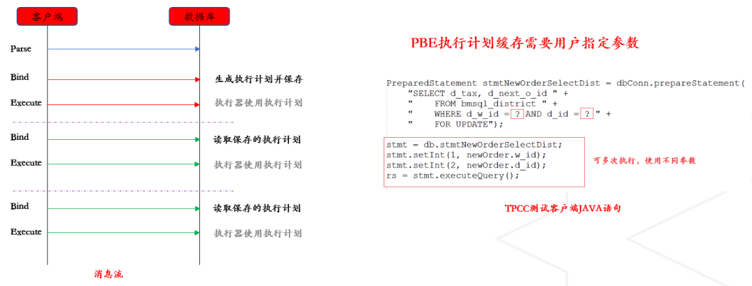 以一个JDBC客户端为例。JAVA程序首先定义一个PreparedStatement对象,SQL中常量全部以参数标识。每次当需要发送SQL请求时,将参数赋值并发送请求到客户端。通过这种方式,可以保证同样形式的SQL(只有常量不同)可以重用相同的执行计划,从而提高执行计划的利用率。