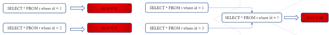此外,为了解决SQL中带有常量从而执行计划缓存复用率不高的问题,数据库在接收到SQL之后,首先会进行常量的参数化,即将SQL中的常量替换为参数,然后根据参数化后的SQL去查询执行计划缓存。通过这种方式保证多条SQL如果只有常量不同,他们可以重用相同的执行计划。