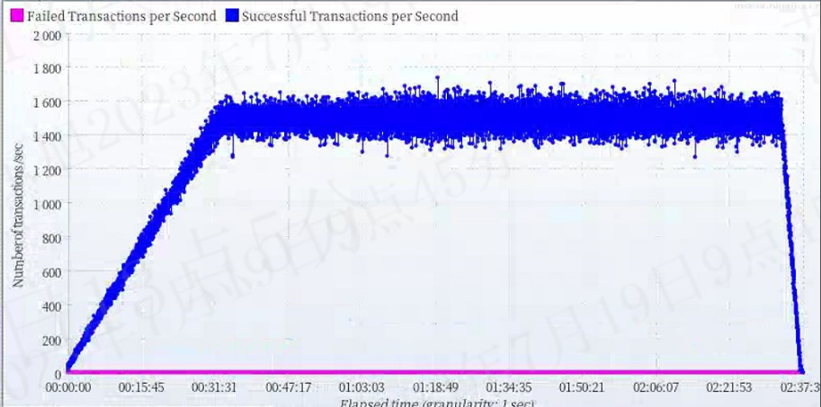 在数据库的压力逐渐增加到5万并发过程中,整个系统的TPS在稳步的增长,波动幅度很小。到5万并发时,TPS稳定在1500左右。经过几个小时的运行,一直非常稳定。