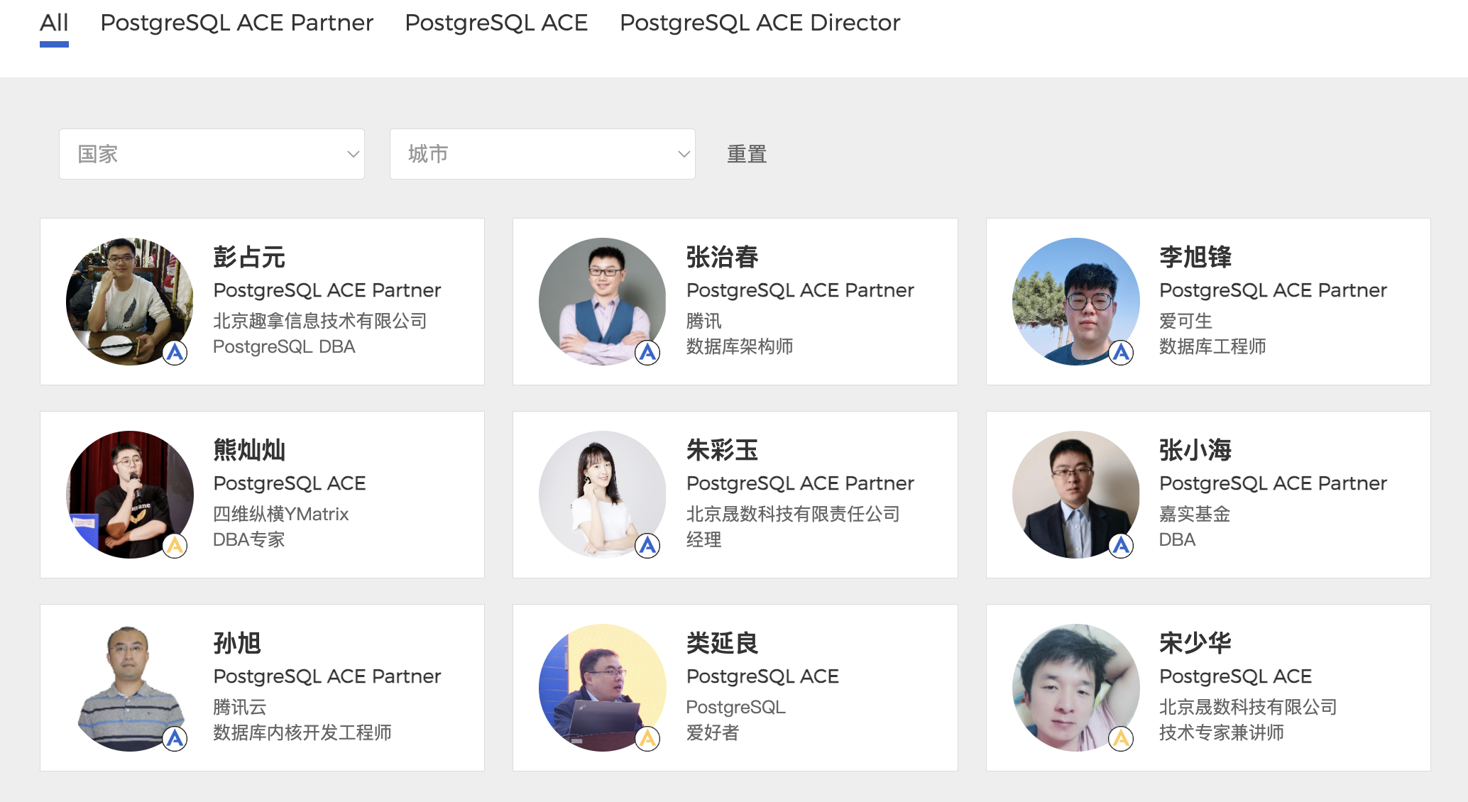 - PostgreSQL ACE:授予行业内知名的PostgreSQL技术专家。