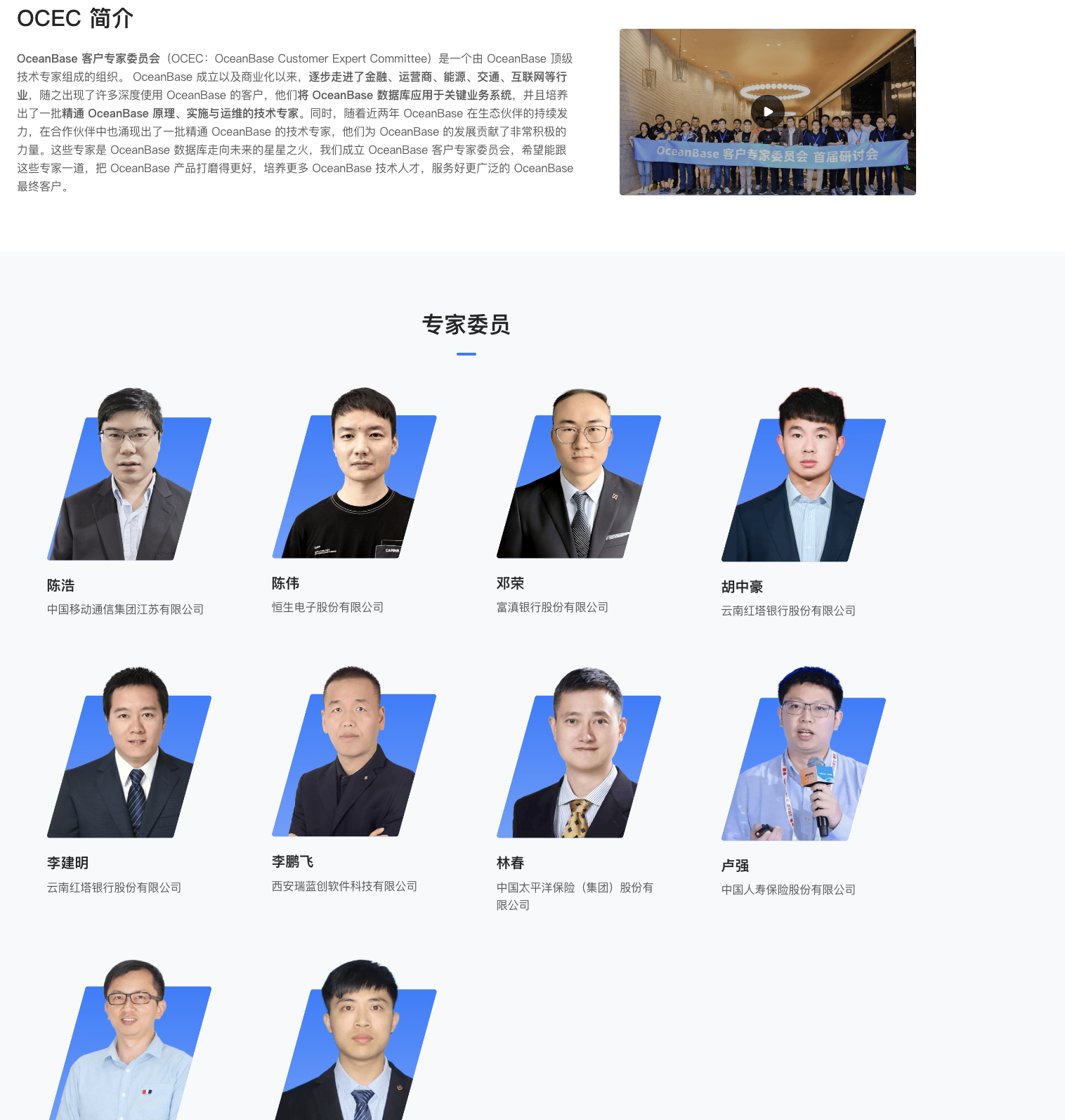OceanBase的客户专家委员会(OCEC)由公司顶级技术专家组成,致力于为OceanBase的技术发展提供指导和支持。此委员会旨在表彰和奖励在OceanBase技术及其推广中做出杰出贡献的专家。目前共有10位专家入选,他们在OceanBase技术架构、应用场景等方面发挥着重要作用。