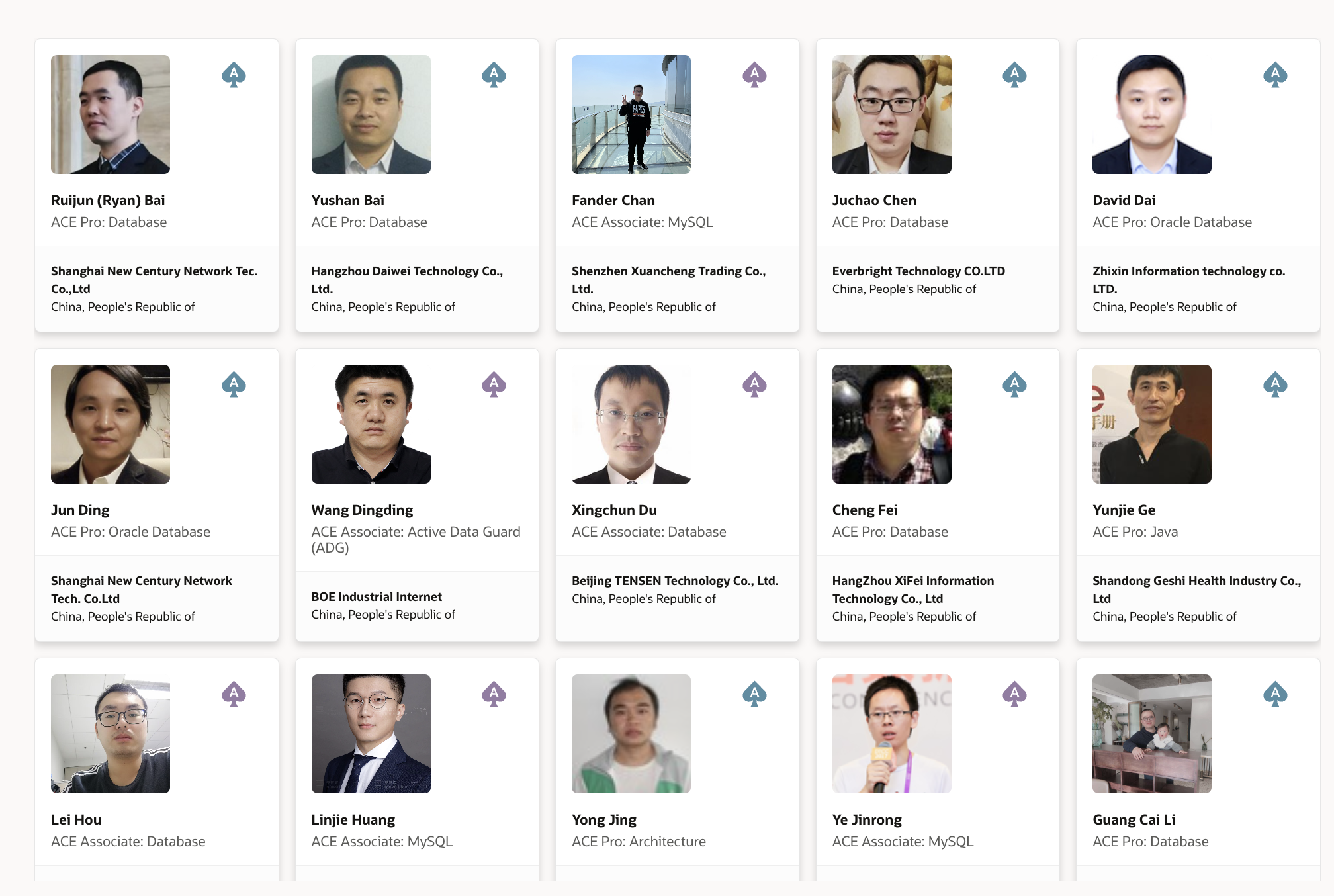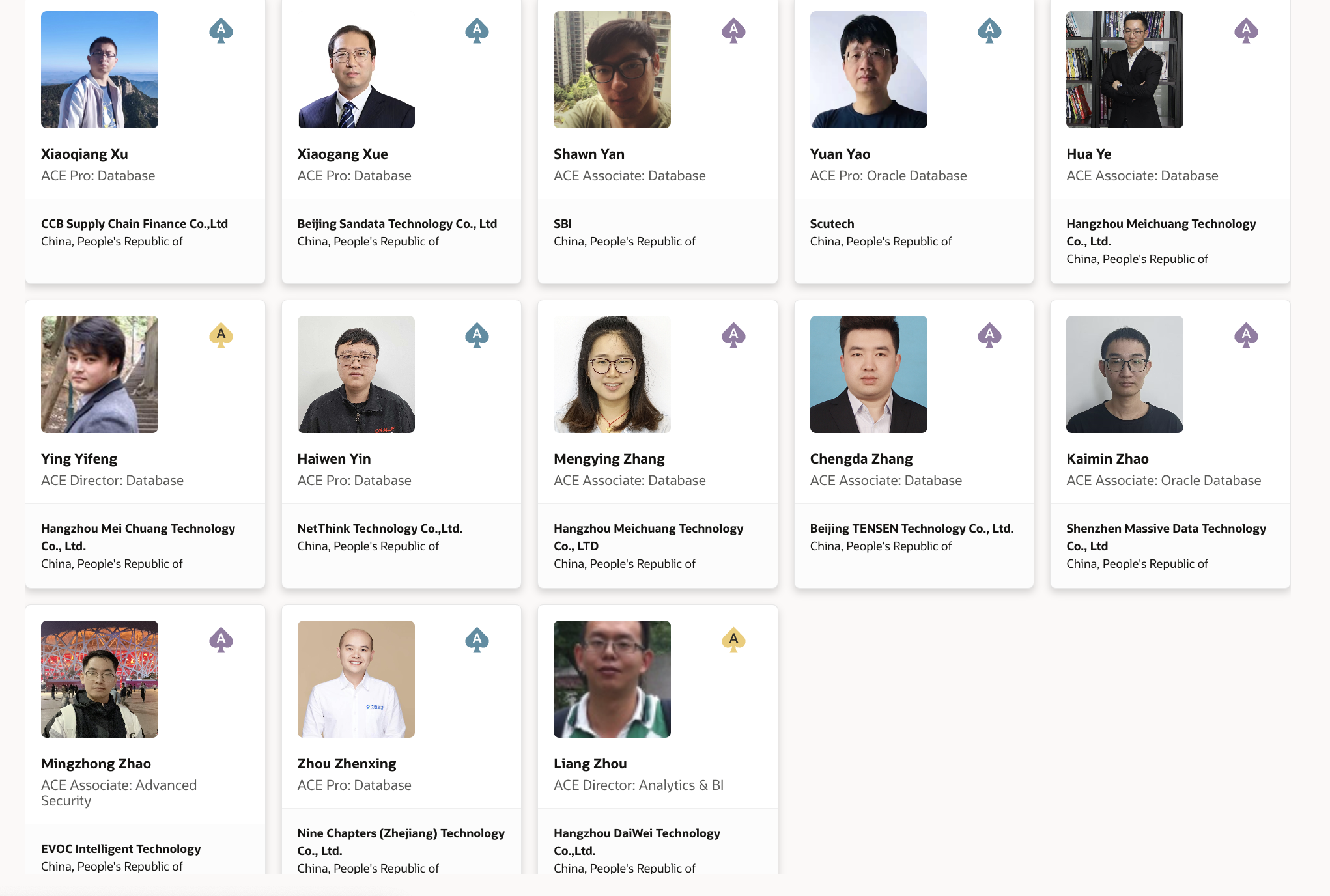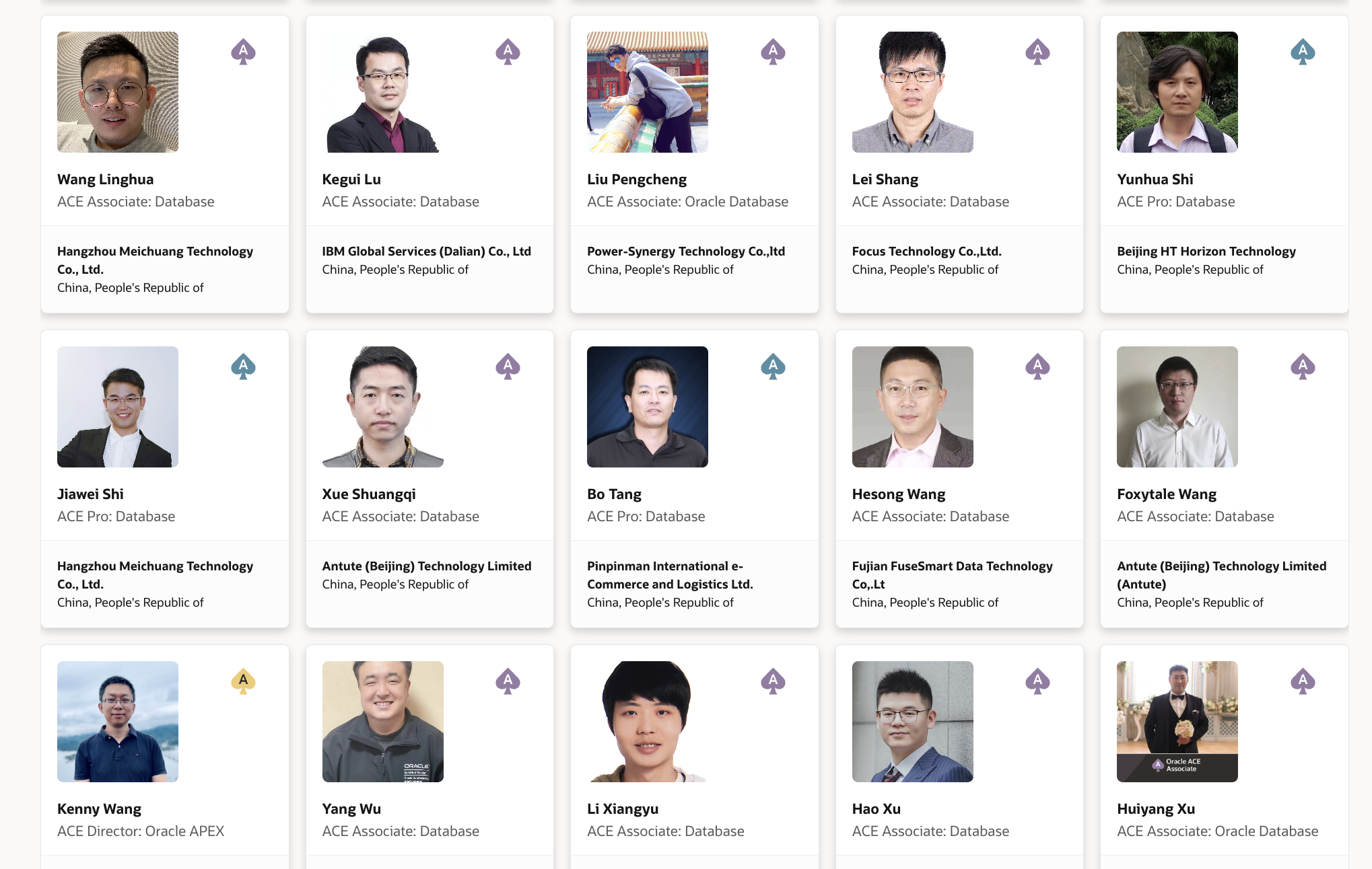 Oracle ACE Associate:此荣誉级别授予那些在Oracle技术社区内有显著贡献,但尚未达到更高级别的专家。ACE Associate通常是刚开始在Oracle技术领域和社区中积累影响力的个人。目前全球有187位,中国有23位专家入选。