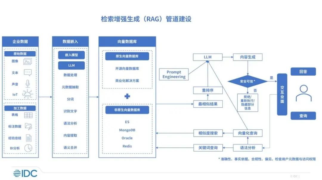 IDC报告指出,生成式AI已经成为企业布局和投资的重点,但通用大语言模型(LLM)在实际应用中仍存在诸多问题,如幻觉问题、回答不准确等,特别是在B端场景中,无法解决企业的实际落地需求。因此,企业需要借助RAG和向量数据库等技术手段,链接企业内部数据库、知识库,提升AI生成的准确性和实用性。