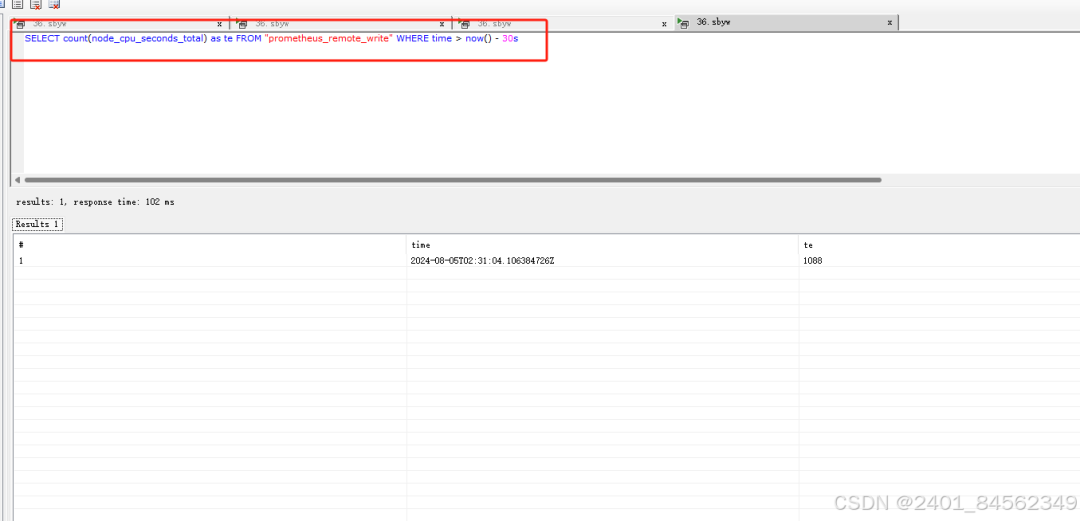 sql = """SELECT node_cpu_seconds_total as system_cpu_usage,cpu as process_occupy_physical_memory_size,job as create_dept,node_memory_MemTotal_bytes as process_read_written_file_system_total_bytes,node_memory_MemAvailable_bytes as process_open_file_describe_quantity,time as create_time FROM "prometheus_remote_write" where time > now() - 1h"""