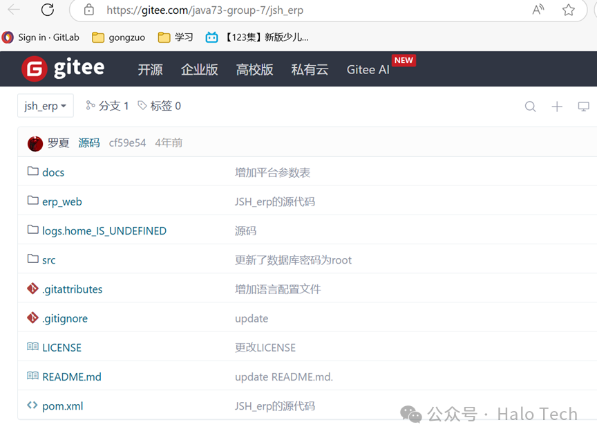下载开源业务源码,从https://gitee.com/java73-group-7/jsh_erp下载源码,这个应用采用的数据库是mysql,所以这次文档以介绍mysql迁移羲和(halo)数据库为主。