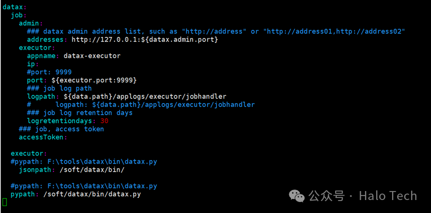 注意修改datax.job.admin.addresses的ip 地址,datax.executor.jsonpath和 datax.pypath目前都是在同一台服务器上安装,所以连接ip可以使用127.0.0.1