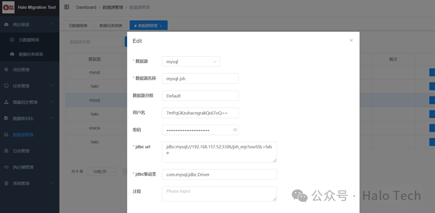 5.2添加需要迁移源mysql和目标端halo的数据源