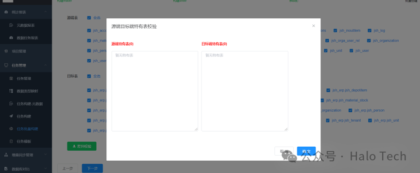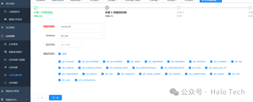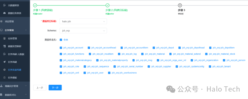 创建数据迁移任务,可以全表,也可以选着某些表。