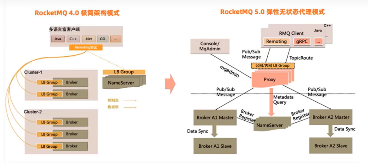 RocketMq 5.0为了更好地拥抱云原生,引入了全新的弹性无状态代理模式,将当前的Broker职责进行拆分,对于客户端协议适配、权限管理、消费管理等计算逻辑进行抽离,独立无状态的代理角色提供服务,Broker则继续专注于存储能力的持续优化。这套模式可以更好地实现在云环境的资源弹性调度。