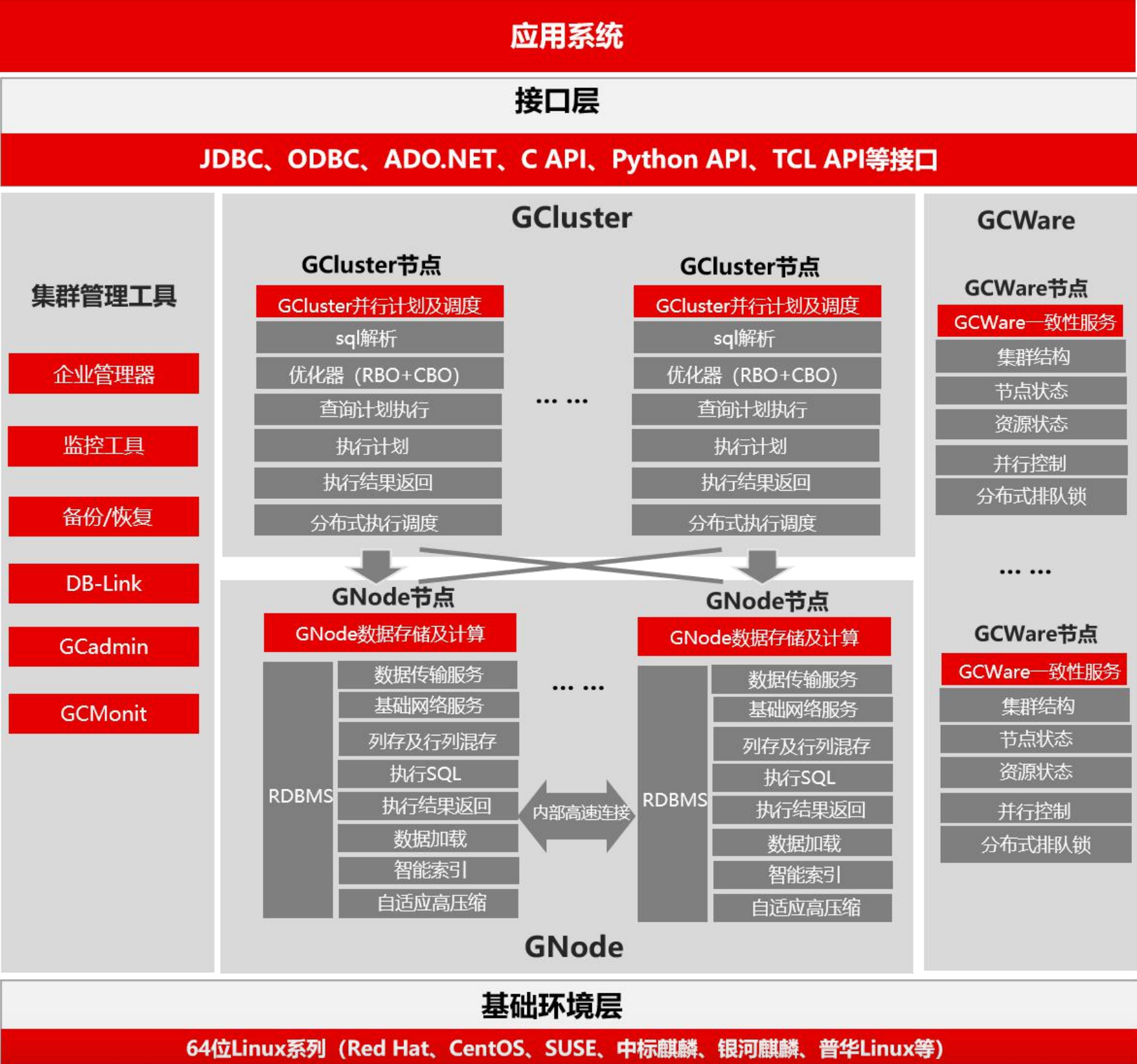 - GCWare:组成分布式管理集群,为集群提供一致性服务。主要负责记录并保存集群结构、节点状态、节点资源状态、并行控制和分布式排队锁等信息。在多副本数据操作时,记录和查询可操作节点,提供各节点数据一致性状态。