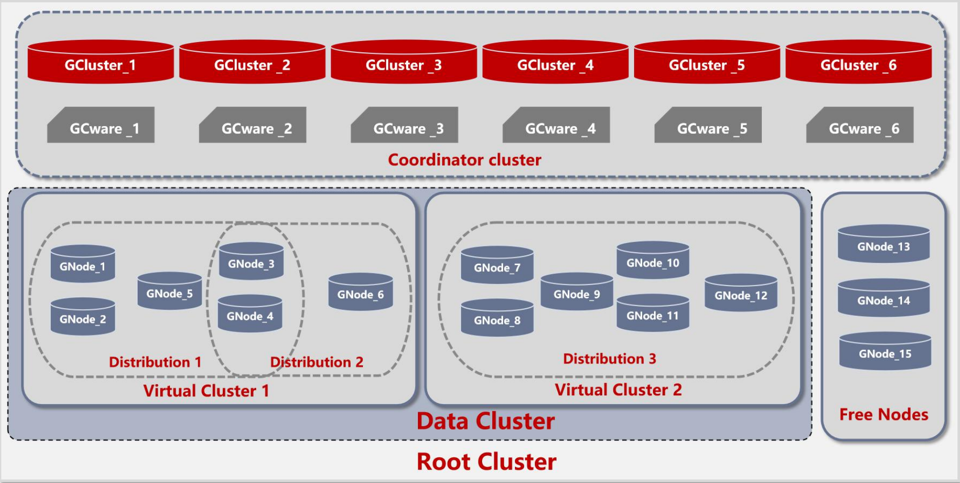 - VC(Virtual Cluster):虚拟集群,是对 Data Cluster 节点的划分,每个 VC 拥有固定数量的Data Cluster 节点。整个集群是由若干个 VC 组成,所有的 VC 由同一套GCluster Cluster 和GCwareCluster 管理,共享统一的入口。可以将不同 Data 集群节点按不同业务特点进行物理隔离,形成各自独立运行的 VC。