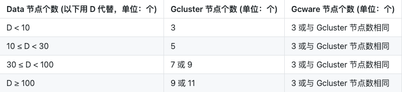 根据集群规模建议集群中 Data 节点、GCluster 节点和 GCware 节点个数分配如下: