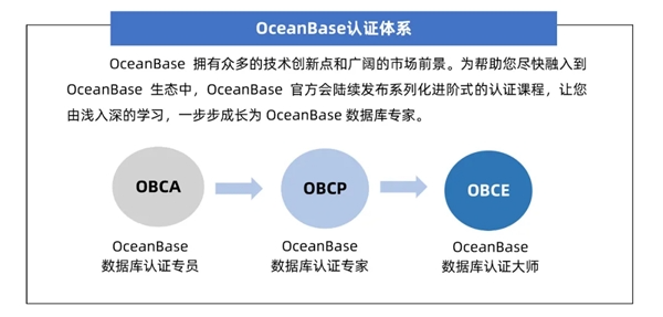 OceanBase 认证体系主要包括 OBCA、OBCP 和 OBCE 三个级别。