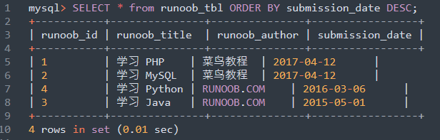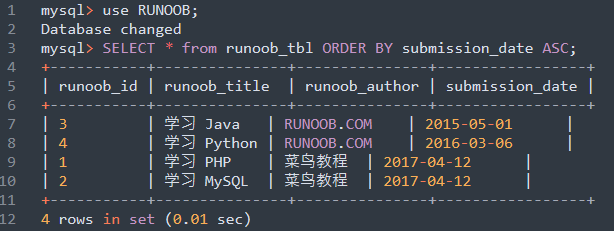 以下将在SQL SELECT语句中使用ORDER BY子句来读取MySQL数据表runoob_tbl中的数据。
